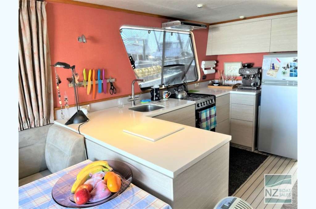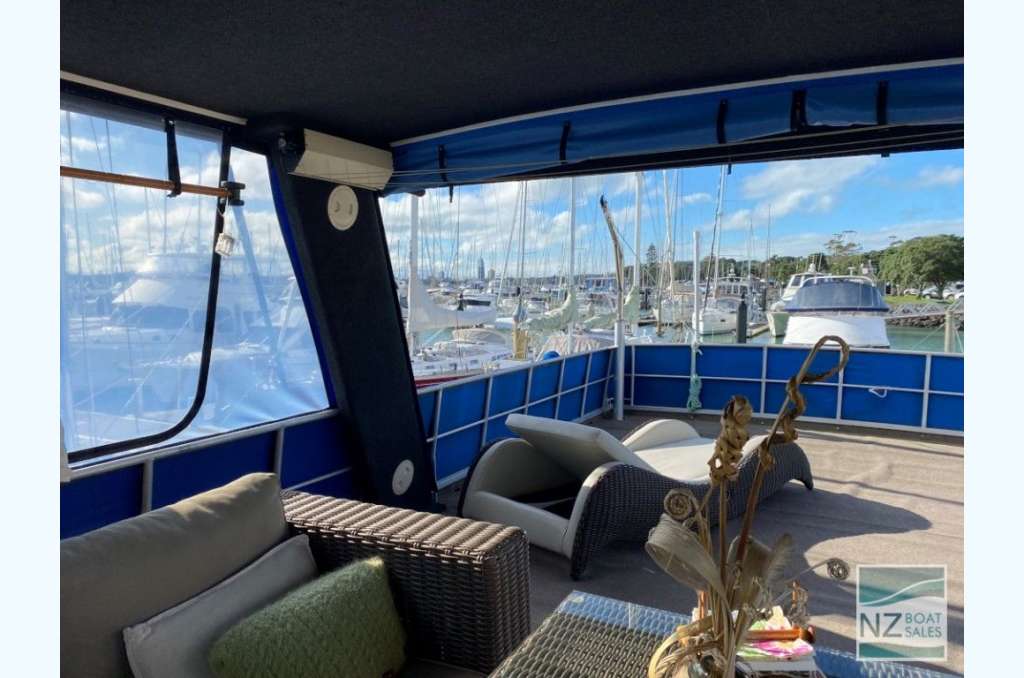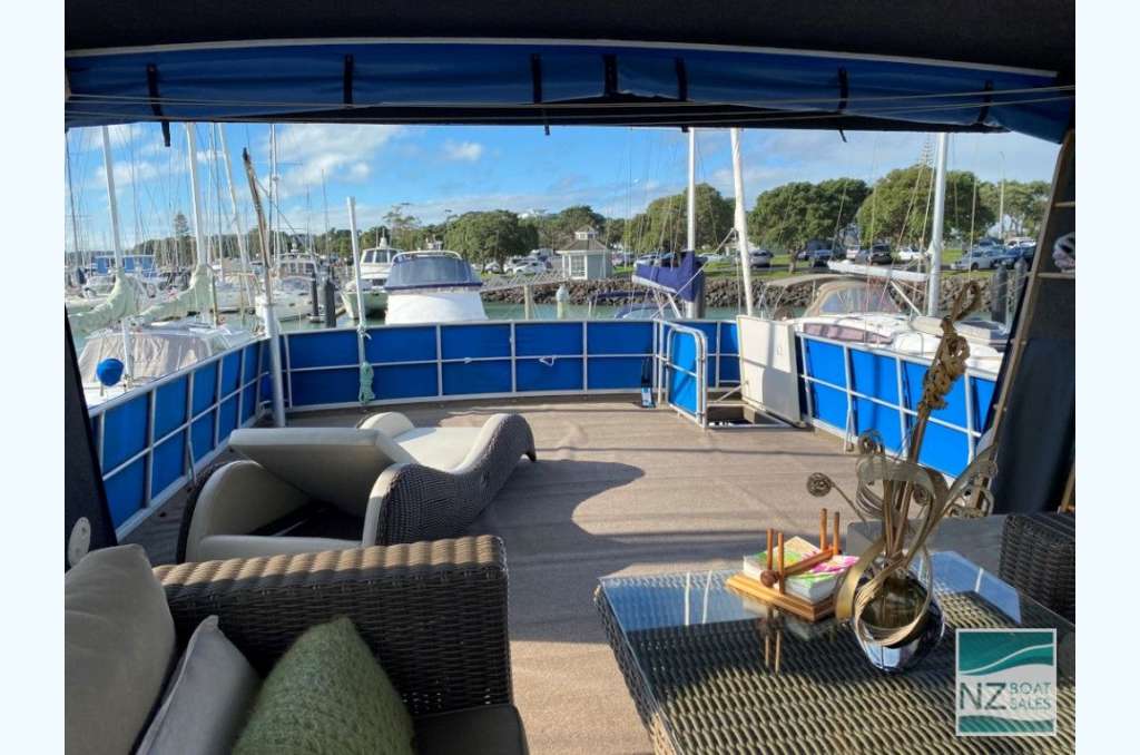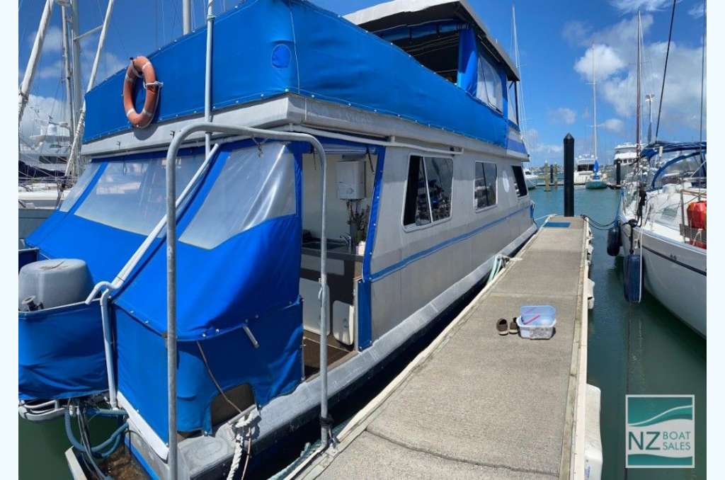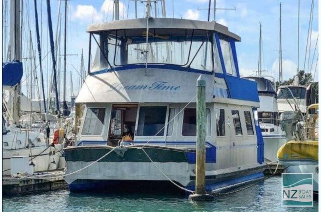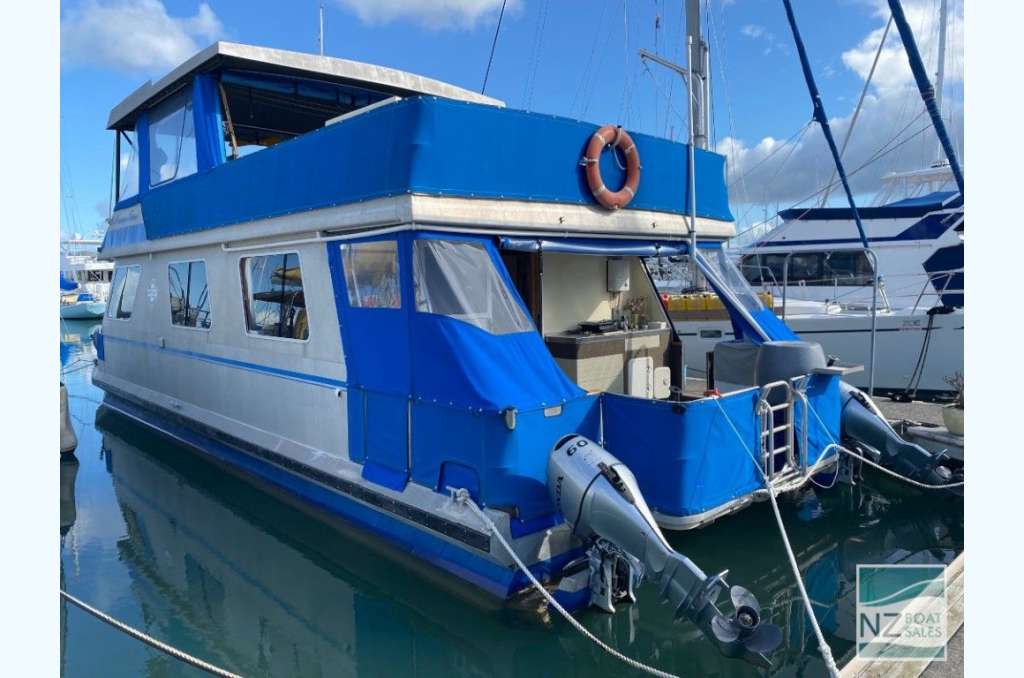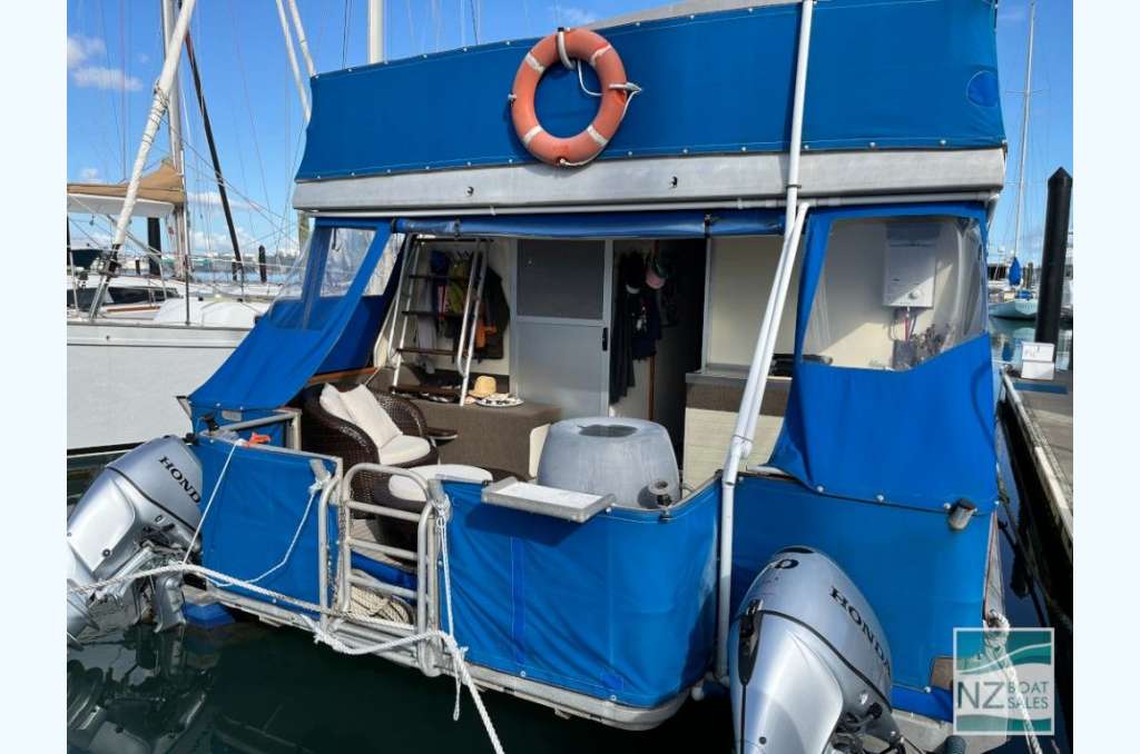 Dreamtime is a professionally built Leisure Cat houseboat by Alloy Boats of Tauranga (2005) — a two-deck aluminium pontoon cat ideal for liveaboard life in Bayswater. Fully furnished with smart storage, fore & aft deck access, and a large open/covered top deck. Layout: 2 cabins (1 double, 1 single), separate shower and toilet with treatment system; modern galley with gas stove (4 burners, oven, grill), 12V fridge & freezer, instant gas hot water. Utilities: shore power plus solar (3×110 W). Repowered with twin Honda 60 hp petrol outboards (Feb 2022); cruises ~4–5 kn, max ~10 kn. Tanks: fuel 240 L, water 720+ L. Equipment includes anchor winch, covers/clears, bimini, crane/davits with dinghy rack, fenders, and fire extinguishers. Live-aboard Bayswater berth available by negotiation. A turnkey floating apartment ready to enjoy.