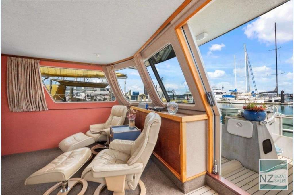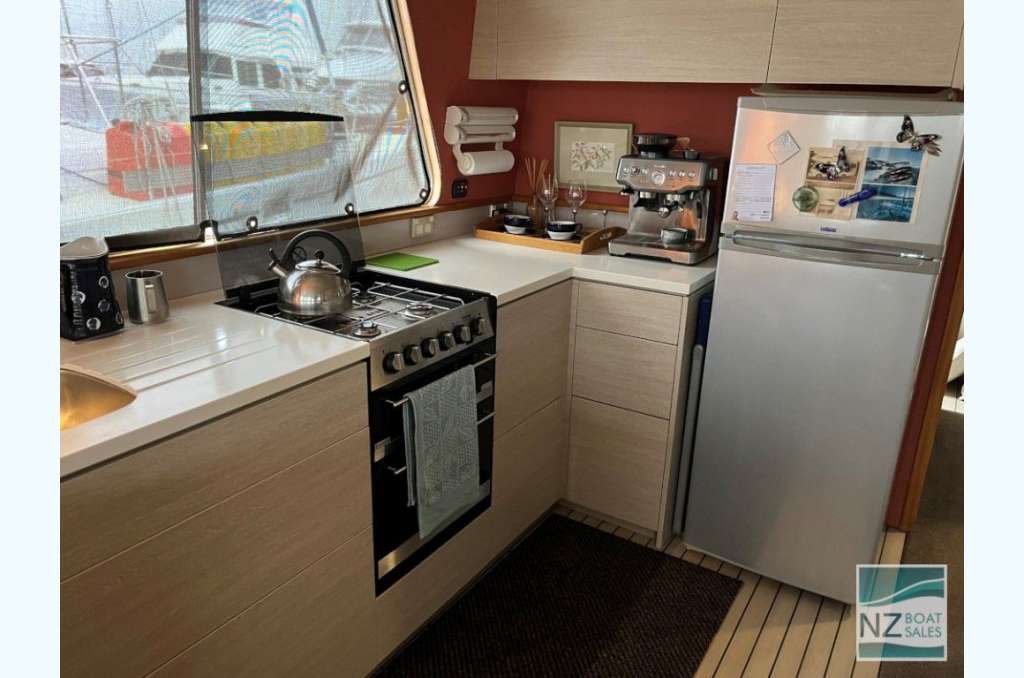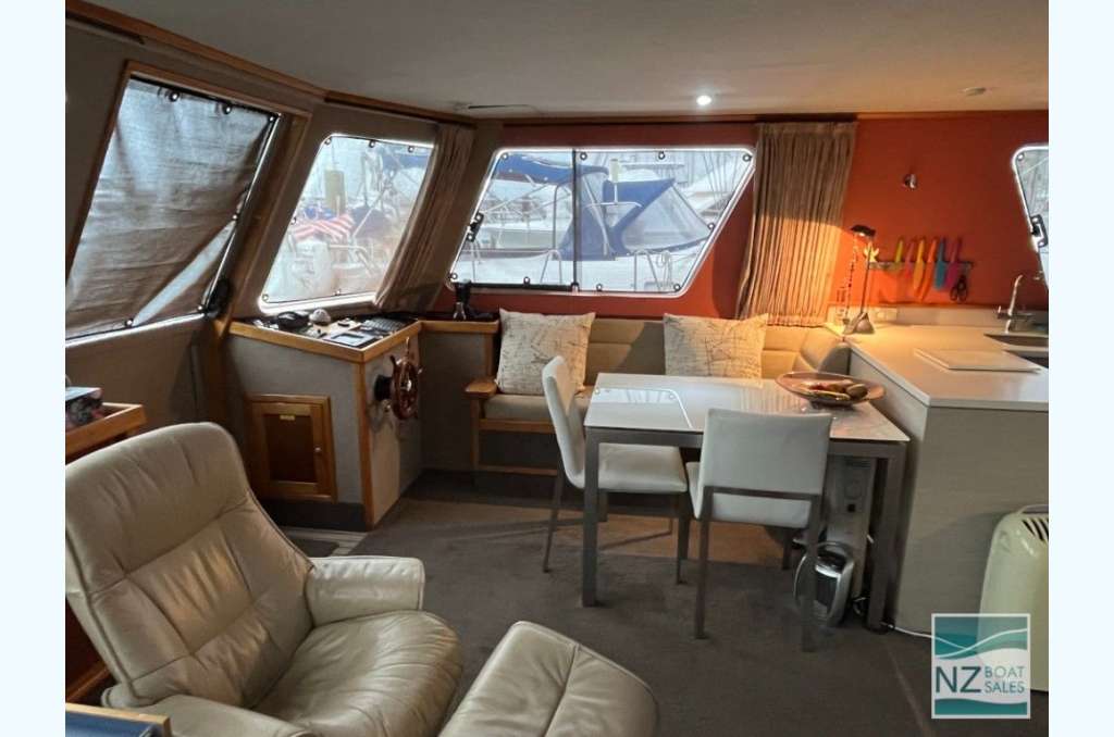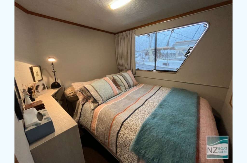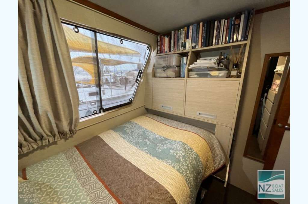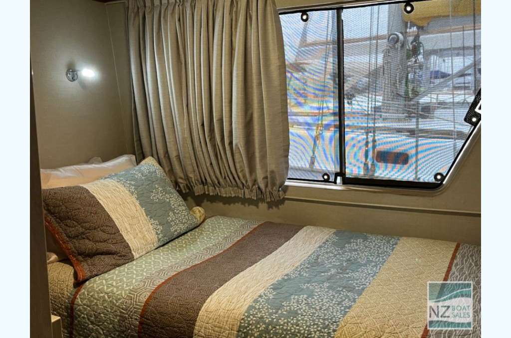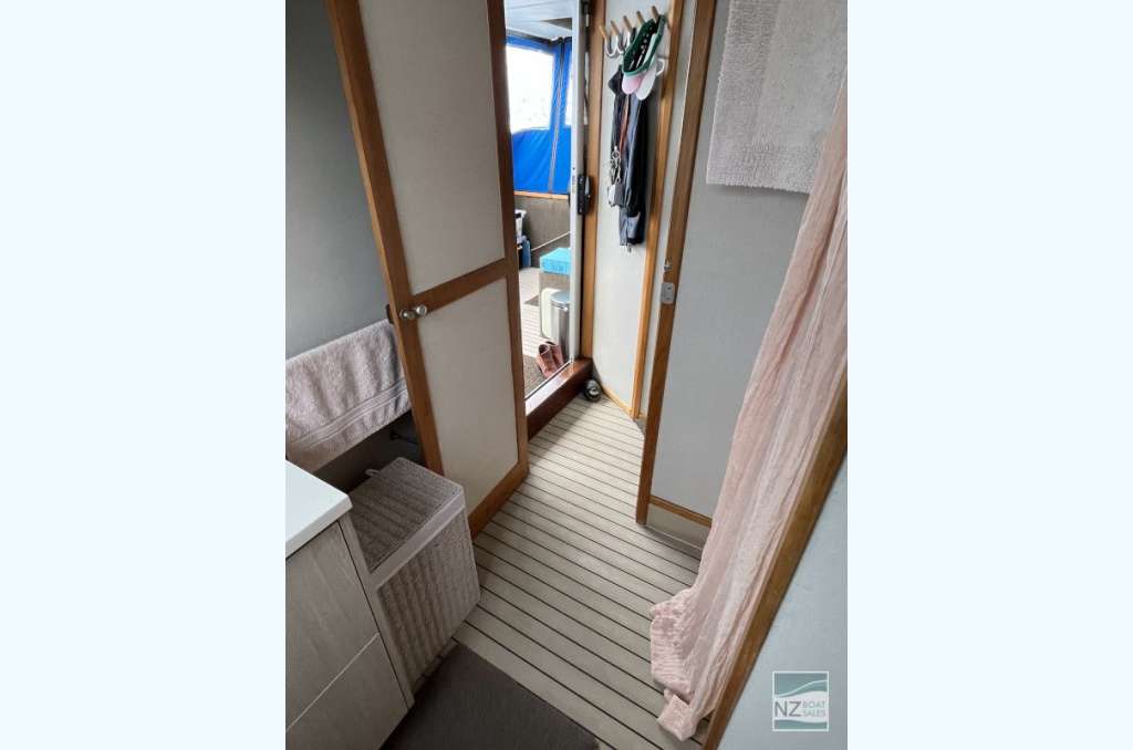 Dreamtime is a professionally built Leisure Cat houseboat by Alloy Boats of Tauranga (2005) — a two-deck aluminium pontoon cat ideal for liveaboard life in Bayswater. Fully furnished with smart storage, fore & aft deck access, and a large open/covered top deck. Layout: 2 cabins (1 double, 1 single), separate shower and toilet with treatment system; modern galley with gas stove (4 burners, oven, grill), 12V fridge & freezer, instant gas hot water. Utilities: shore power plus solar (3×110 W). Repowered with twin Honda 60 hp petrol outboards (Feb 2022); cruises ~4–5 kn, max ~10 kn. Tanks: fuel 240 L, water 720+ L. Equipment includes anchor winch, covers/clears, bimini, crane/davits with dinghy rack, fenders, and fire extinguishers. Live-aboard Bayswater berth available by negotiation. A turnkey floating apartment ready to enjoy.